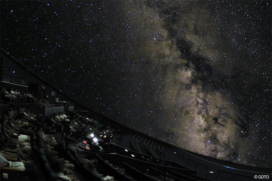 プラネタリウムドームは、直径27.5m、世界最大級の大きさで足元から頭上まで星空や映像に包まれます。
